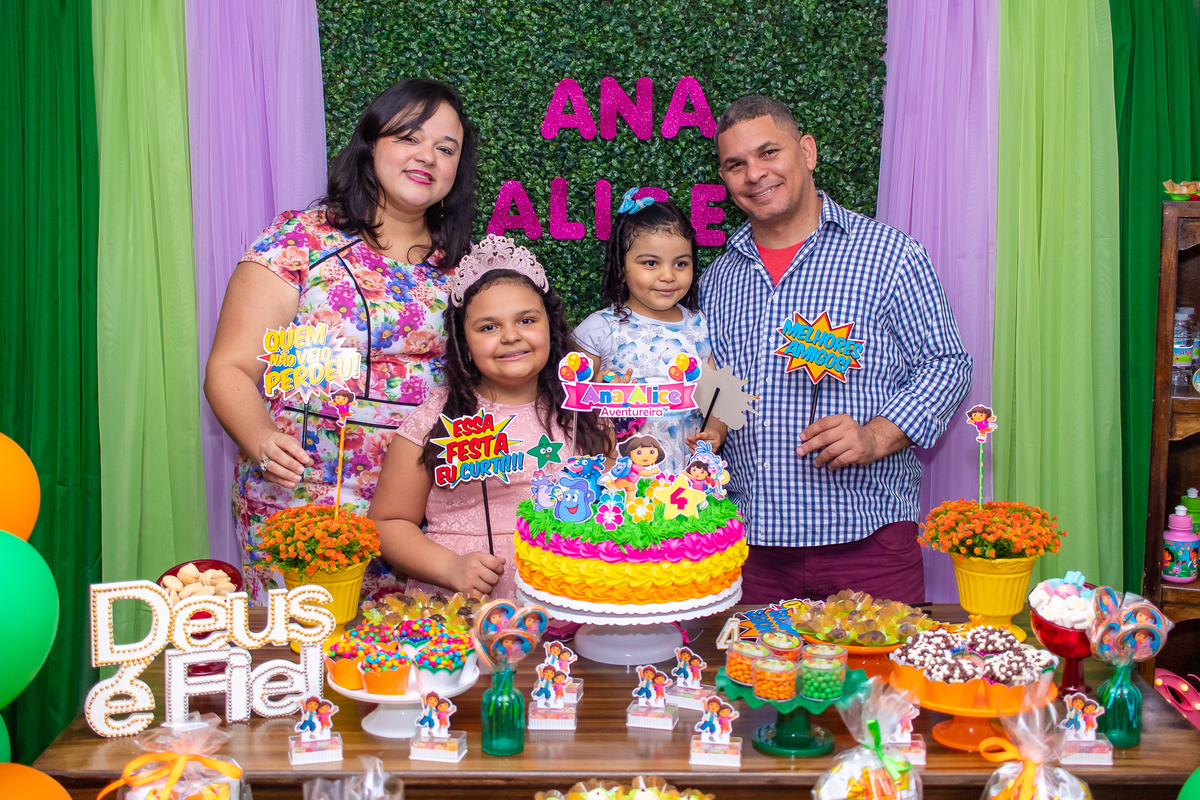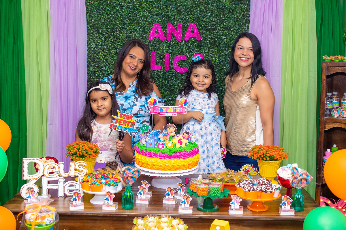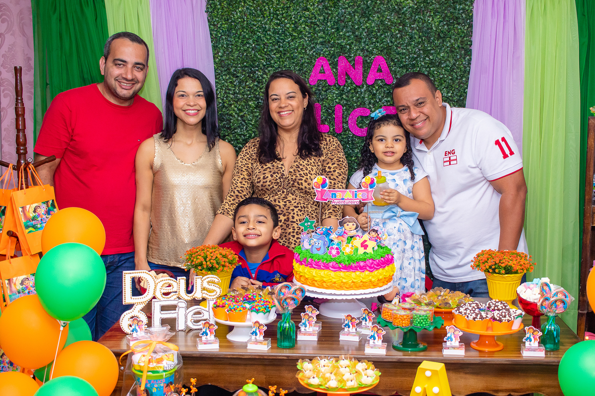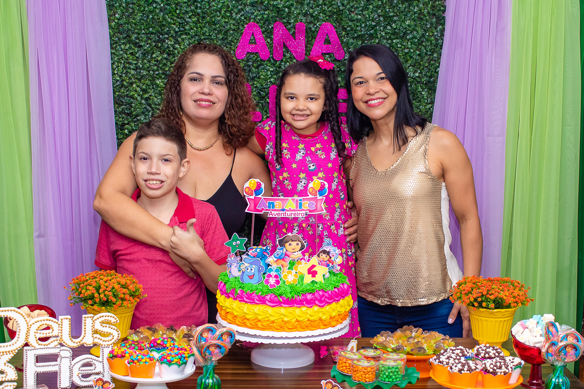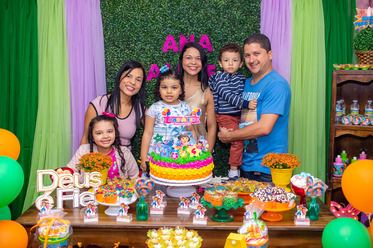 Comemoramos o 4º aniversário da Ana Alice, com uma festa muito animada junto com toda a família, desta vez com o tema da Dora, a Aventureira.