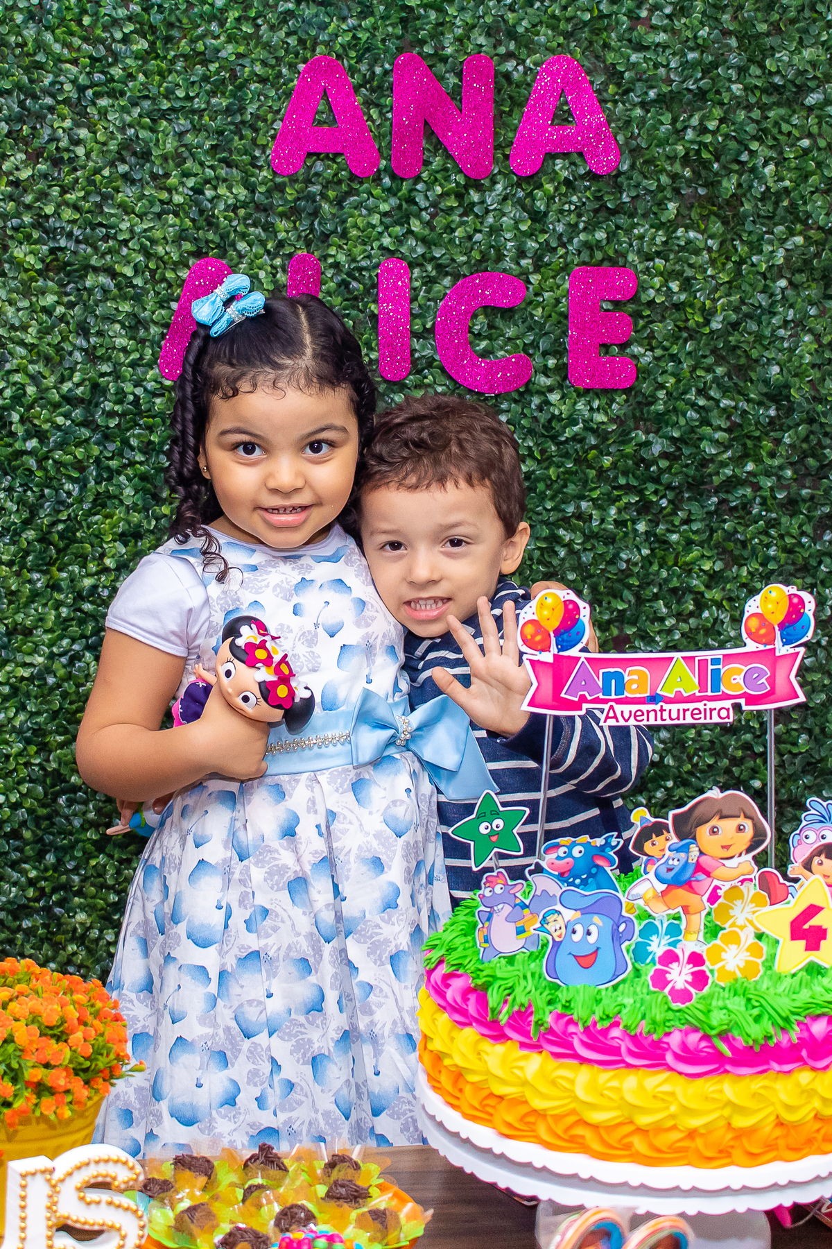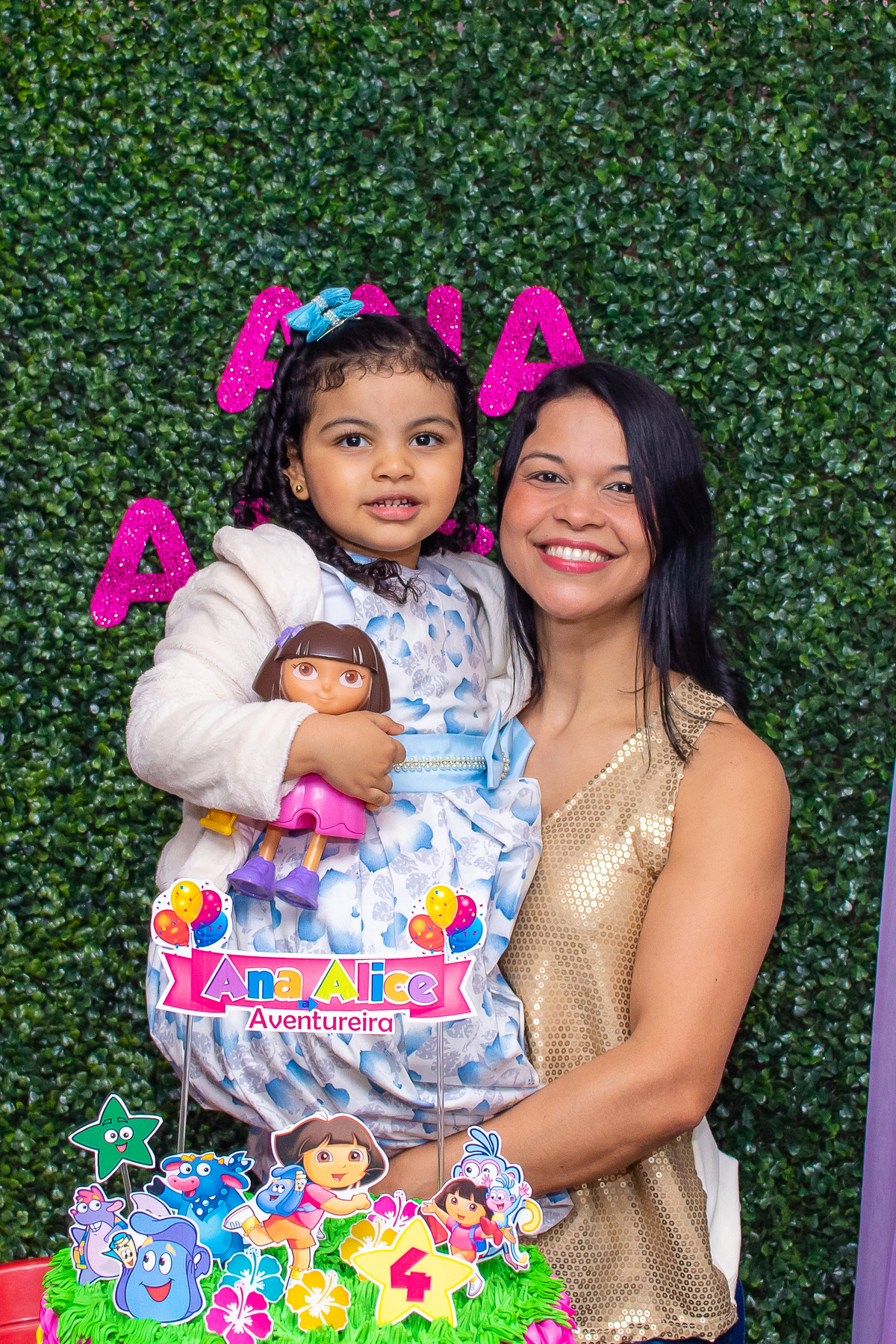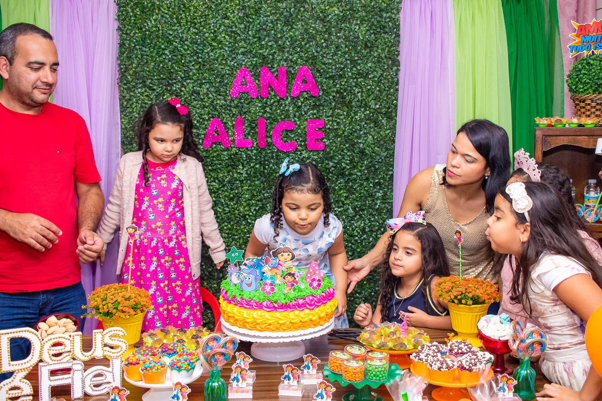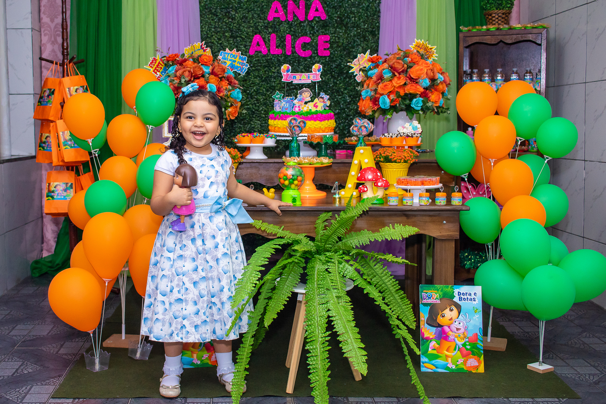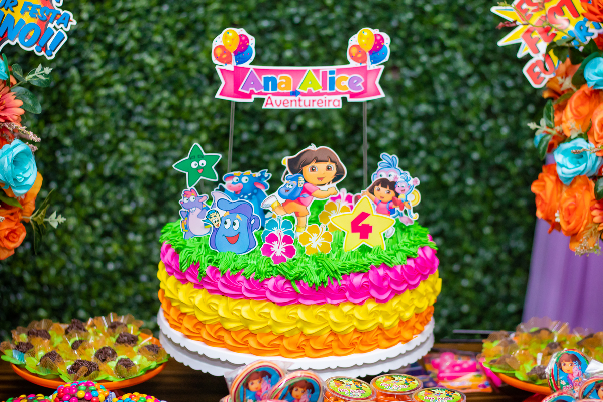 Comemoramos o 4º aniversário da Ana Alice, com uma festa muito animada junto com toda a família, desta vez com o tema da Dora, a Aventureira.