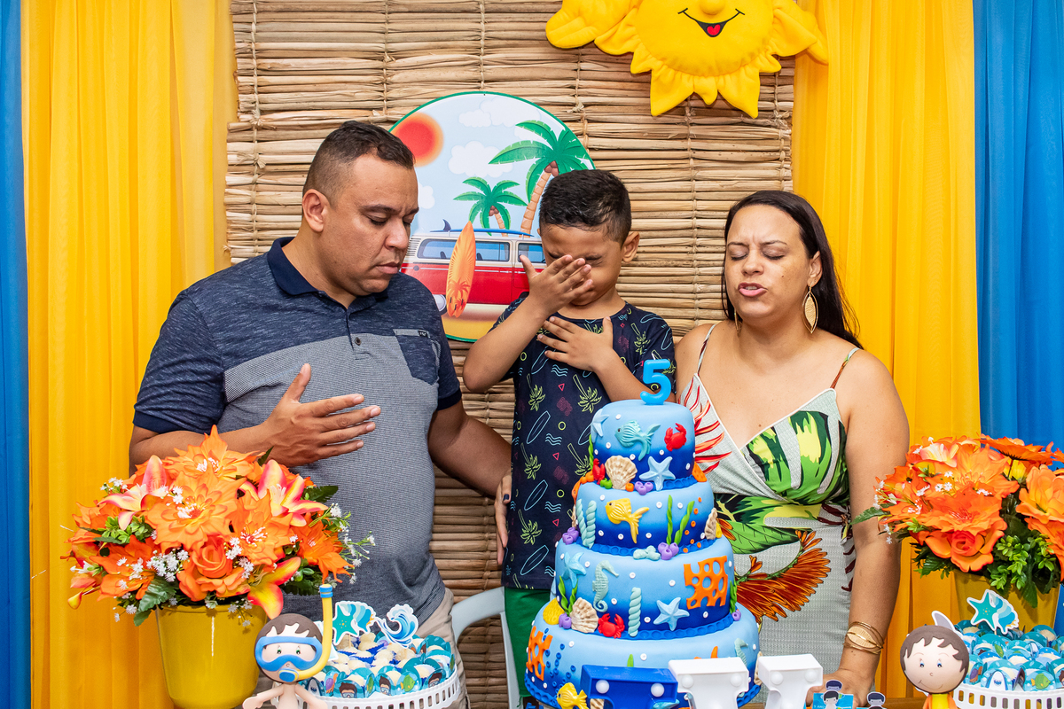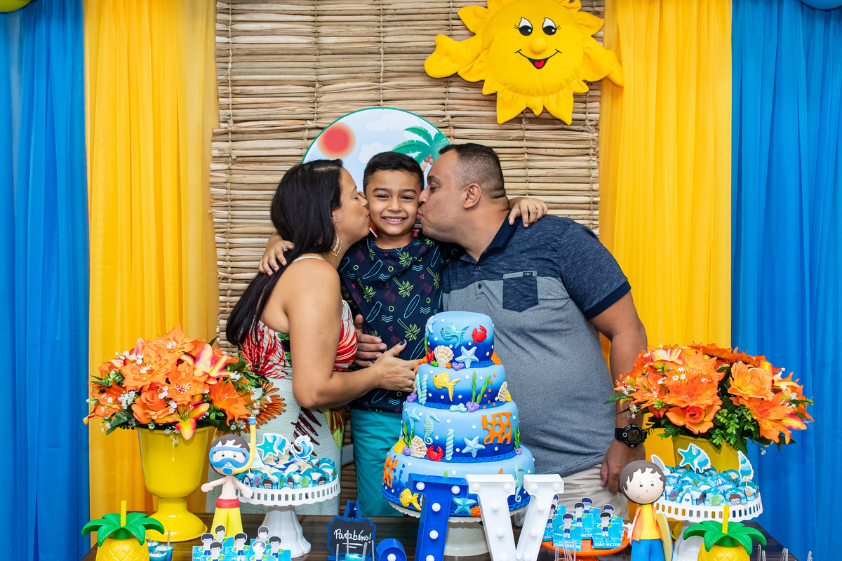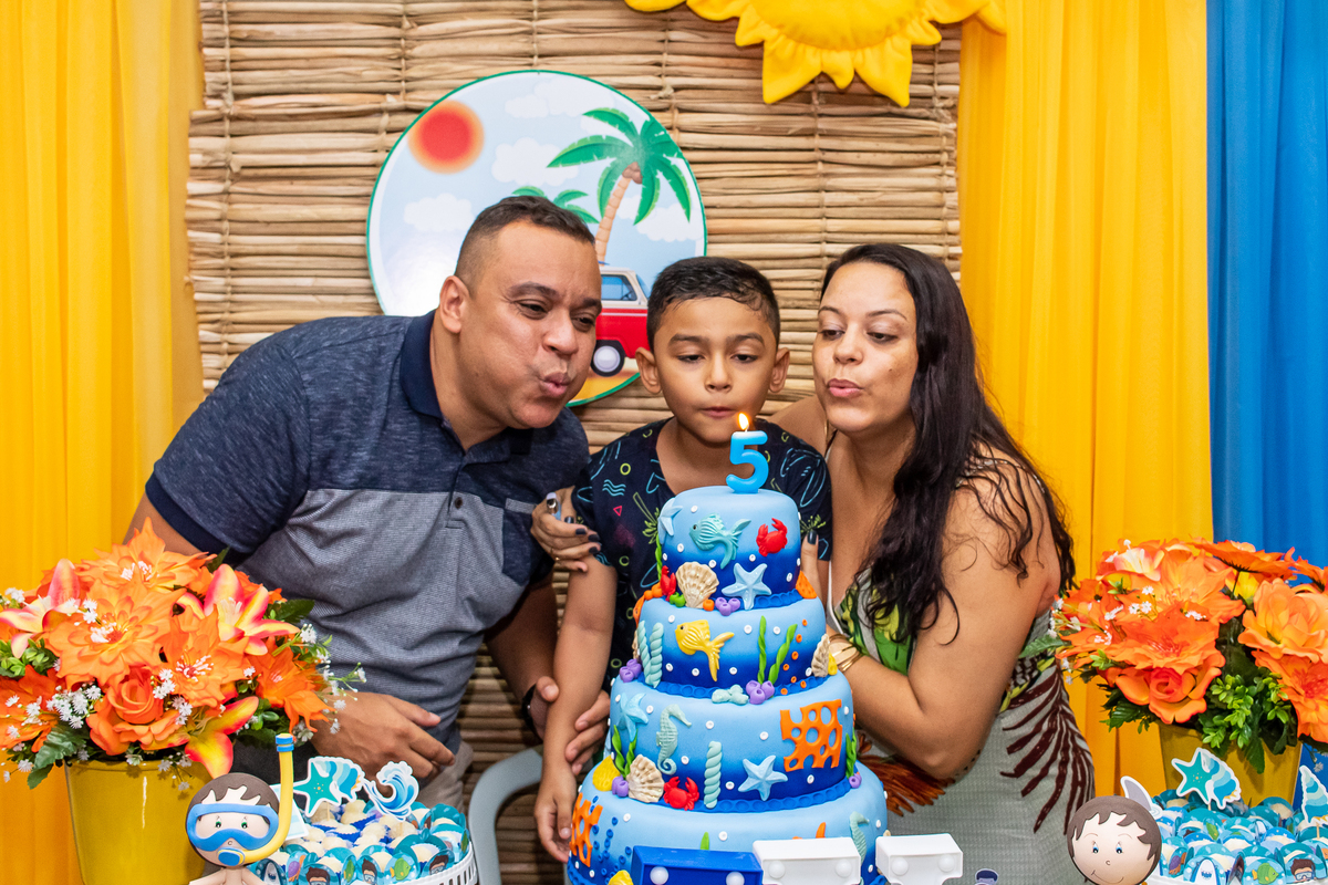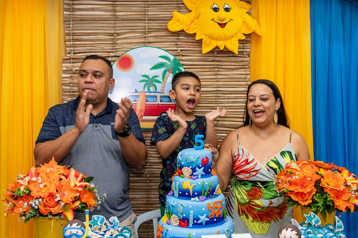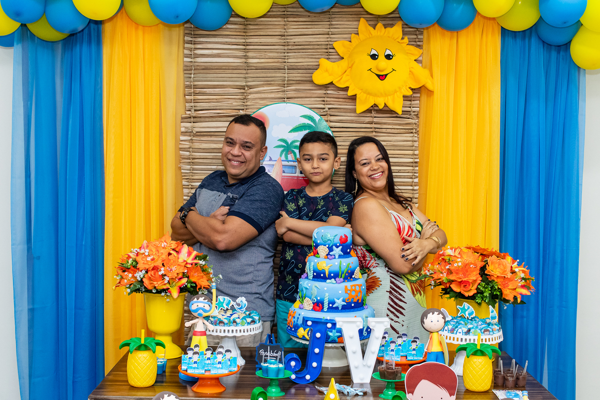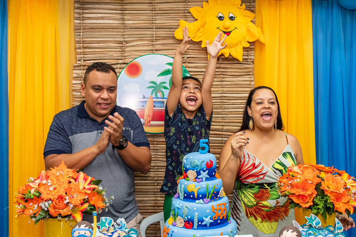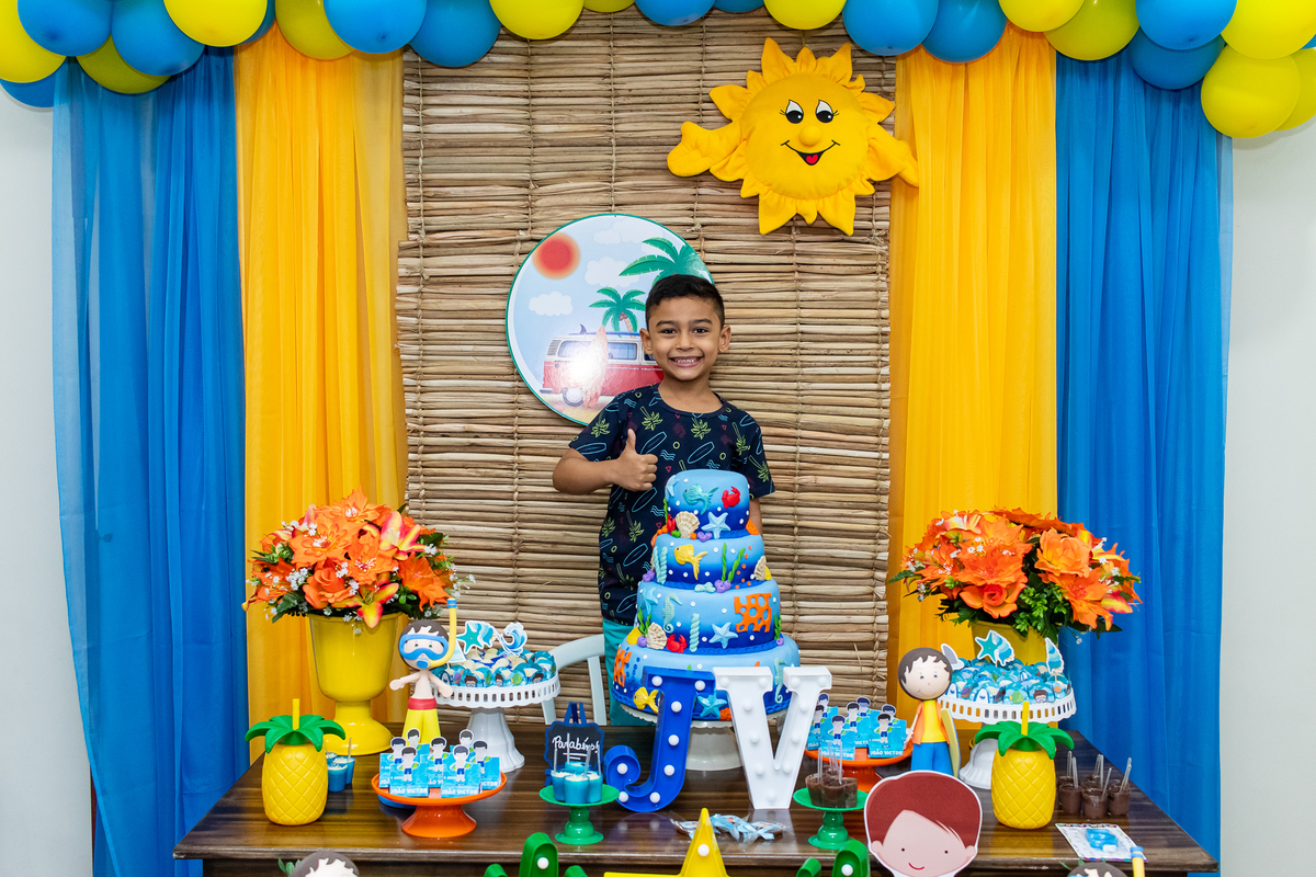 Na festa de aniversário de 5 anos do João Victor, o tema foi praia e aventura, com uma decoração linda e bem colorida. Não faltaram brincadeiras pras crianças se divertirem, e os pais também!