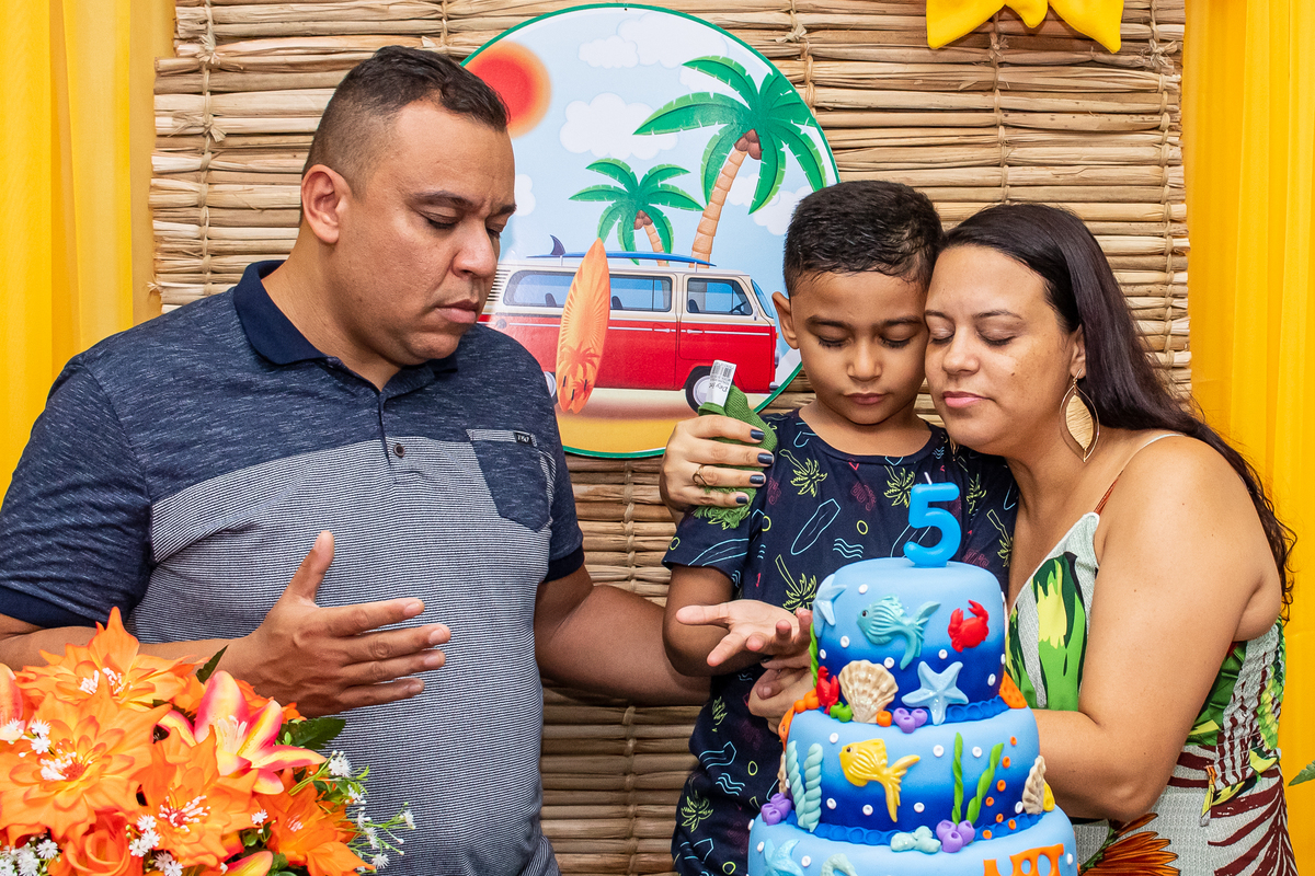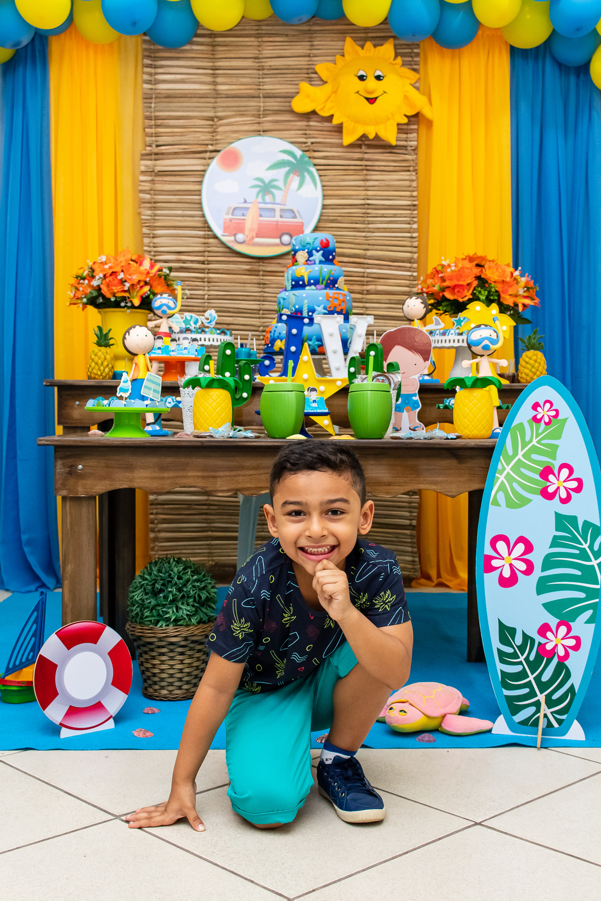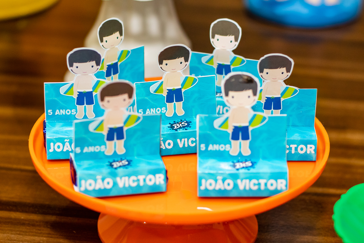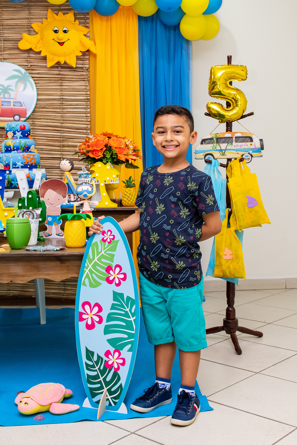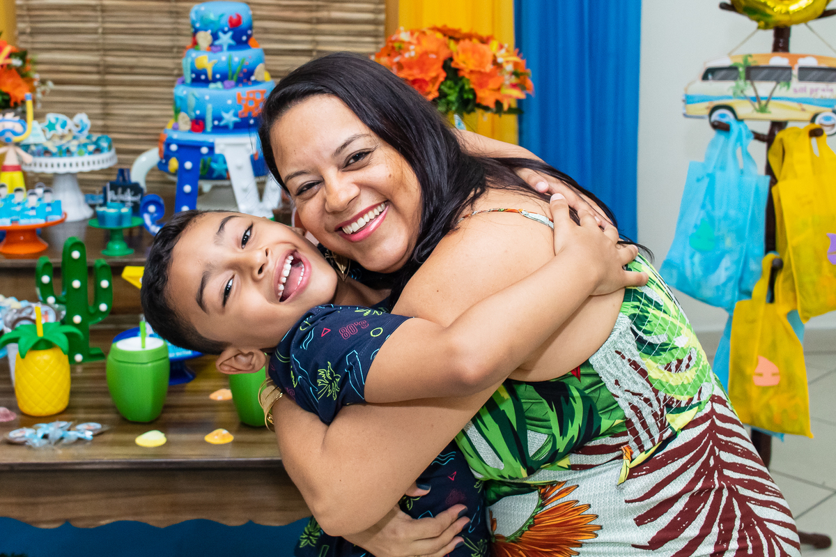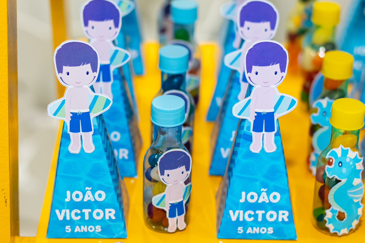 Na festa de aniversário de 5 anos do João Victor, o tema foi praia e aventura, com uma decoração linda e bem colorida. Não faltaram brincadeiras pras crianças se divertirem, e os pais também!
