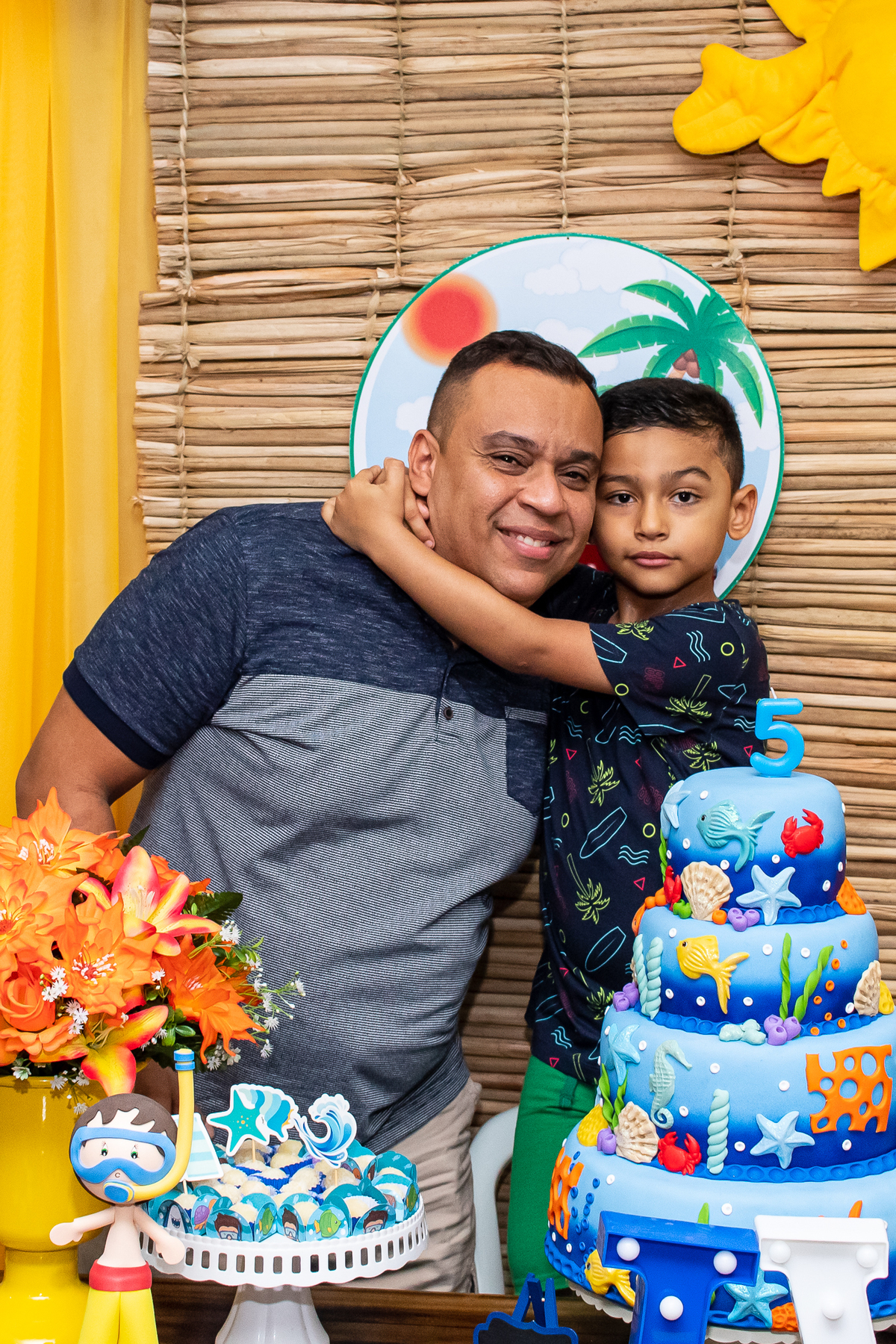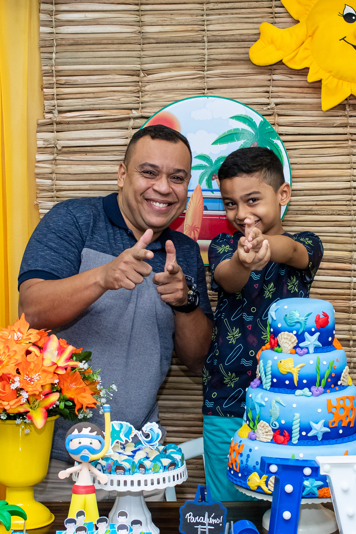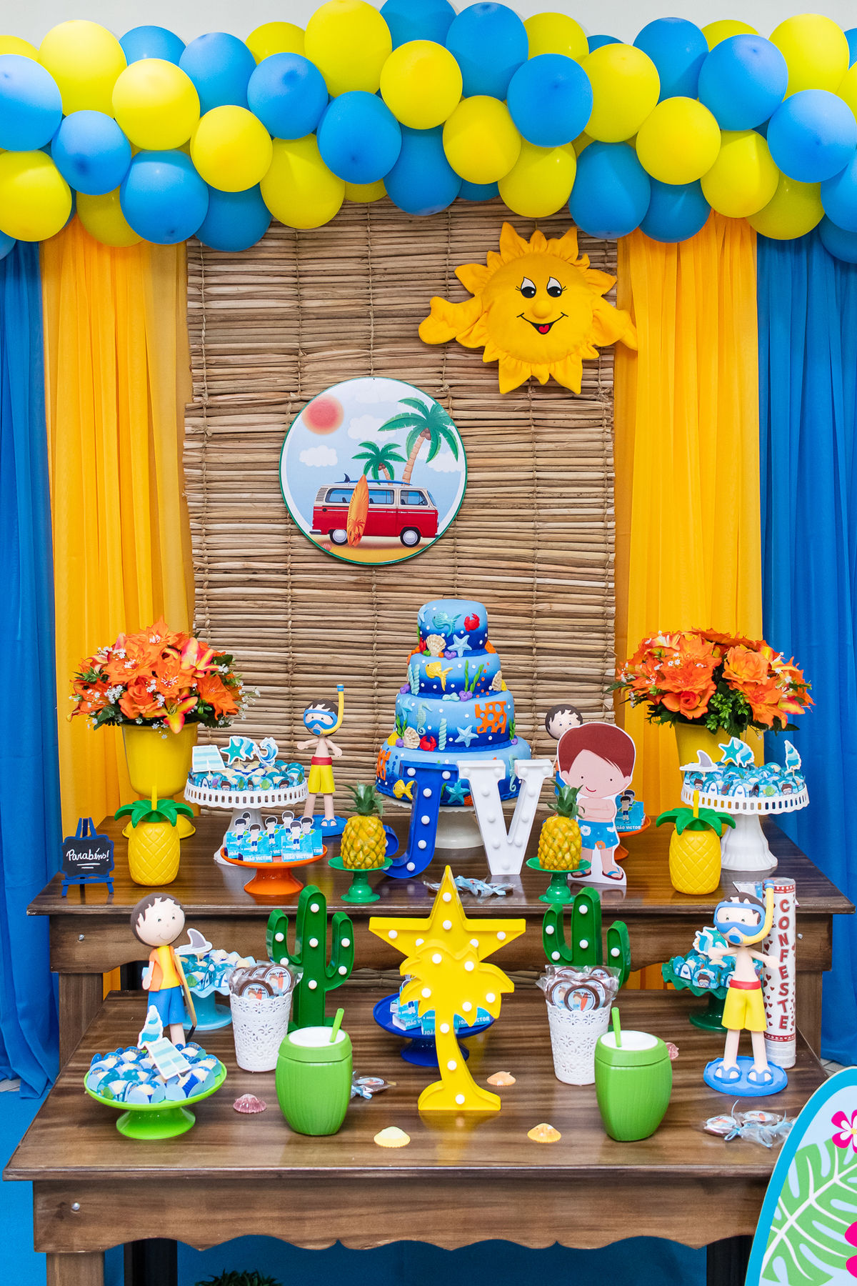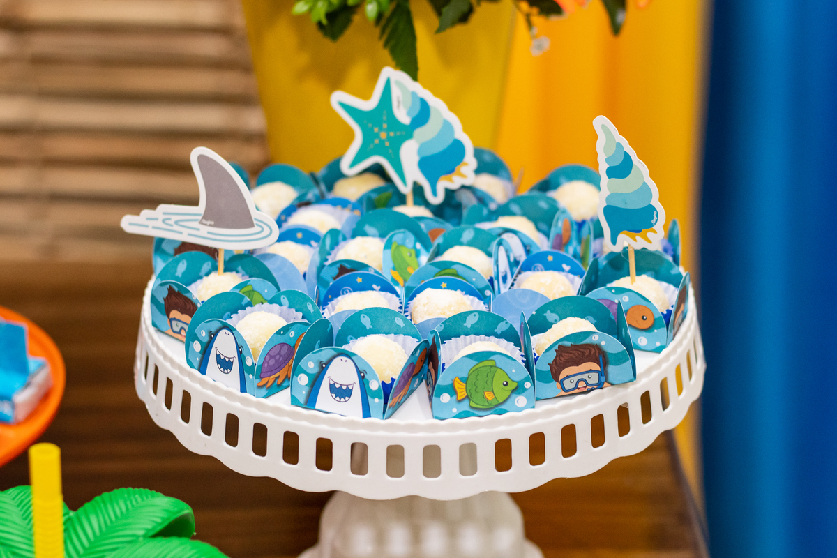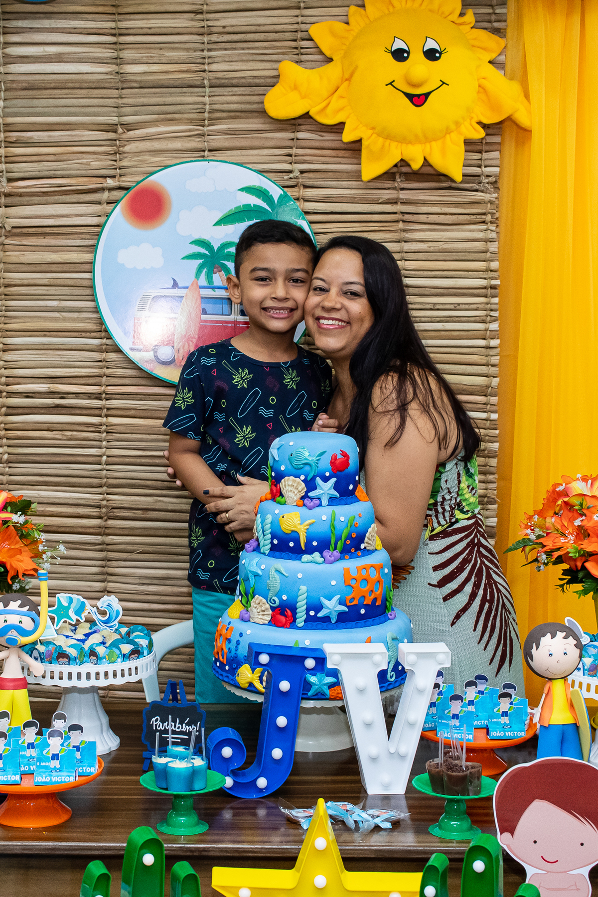 Na festa de aniversário de 5 anos do João Victor, o tema foi praia e aventura, com uma decoração linda e bem colorida. Não faltaram brincadeiras pras crianças se divertirem, e os pais também!